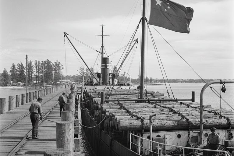 The sun cast a warm glow over the bustling jetty, where fishermen mended their nets and seagulls squawked overhead, their cries mingling with the cheerful chatter of locals enjoying the idyllic scenery. The SS Orient, an aging steamship, was scheduled to arrive later that day, to load timber, promising a flurry of activity and a welcome influx of news and supplies from distant lands.